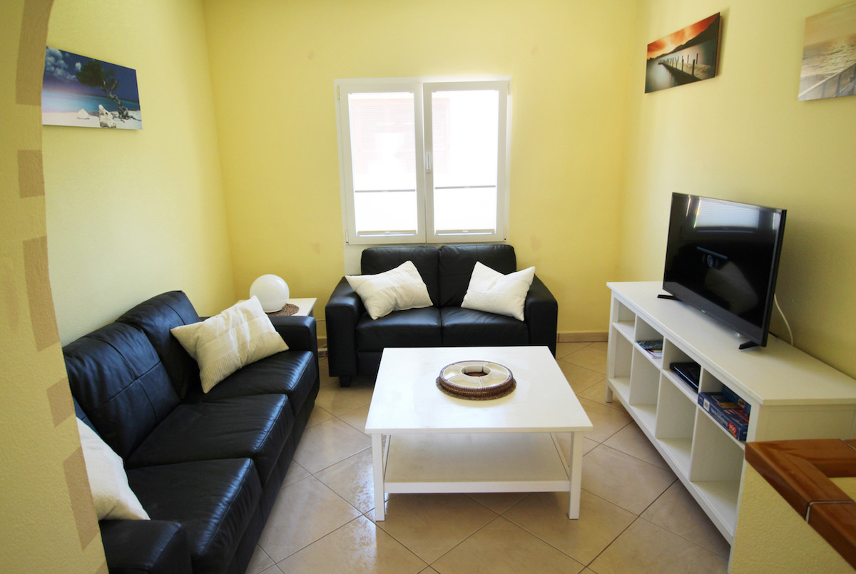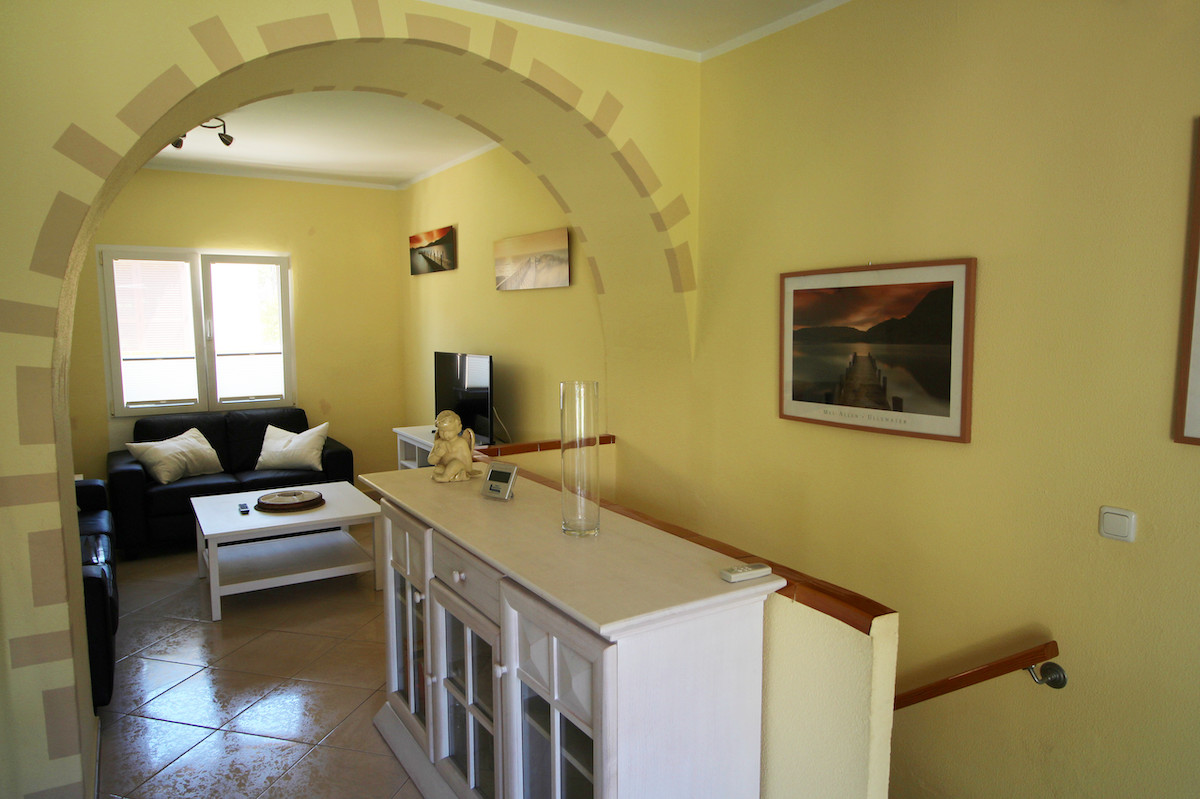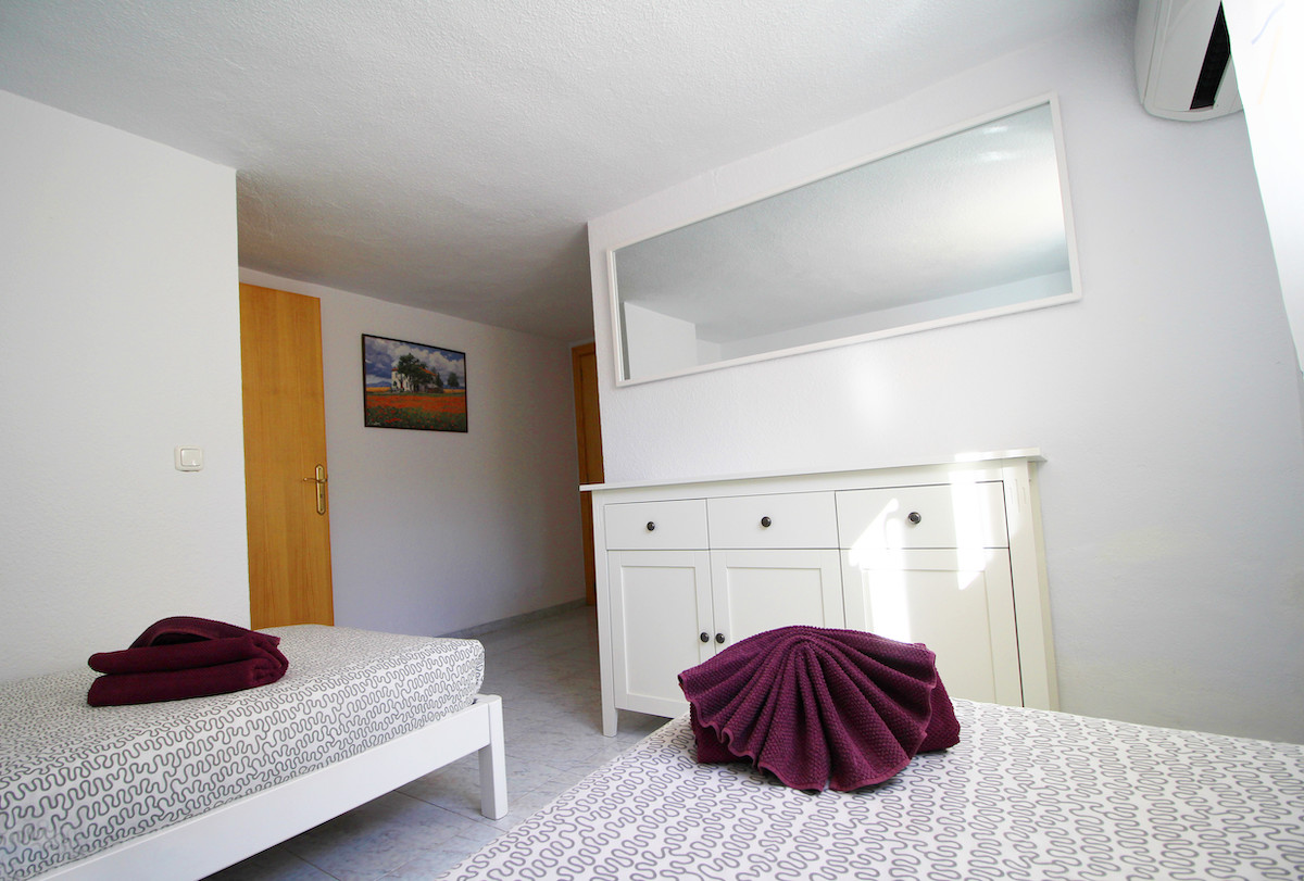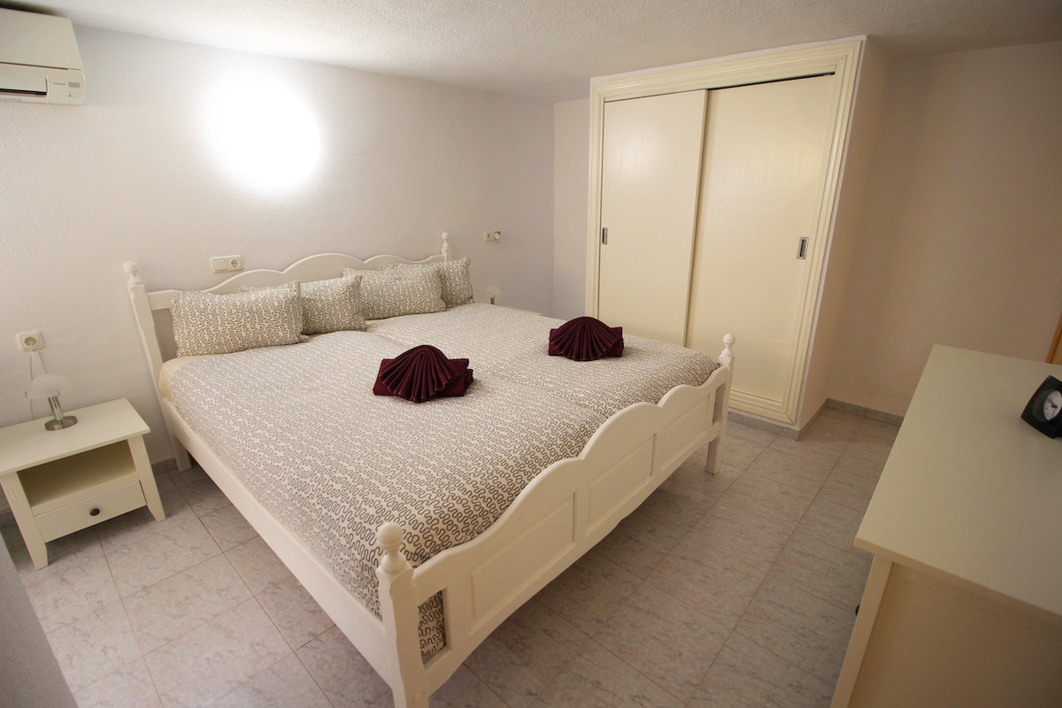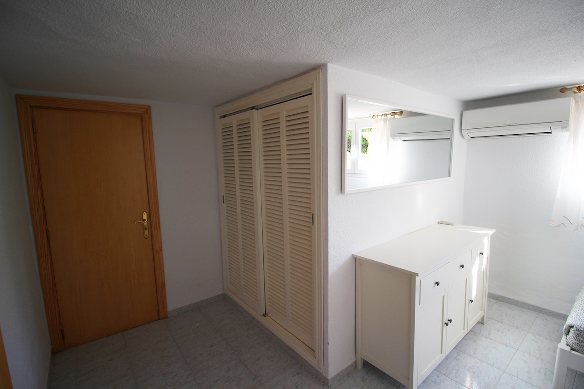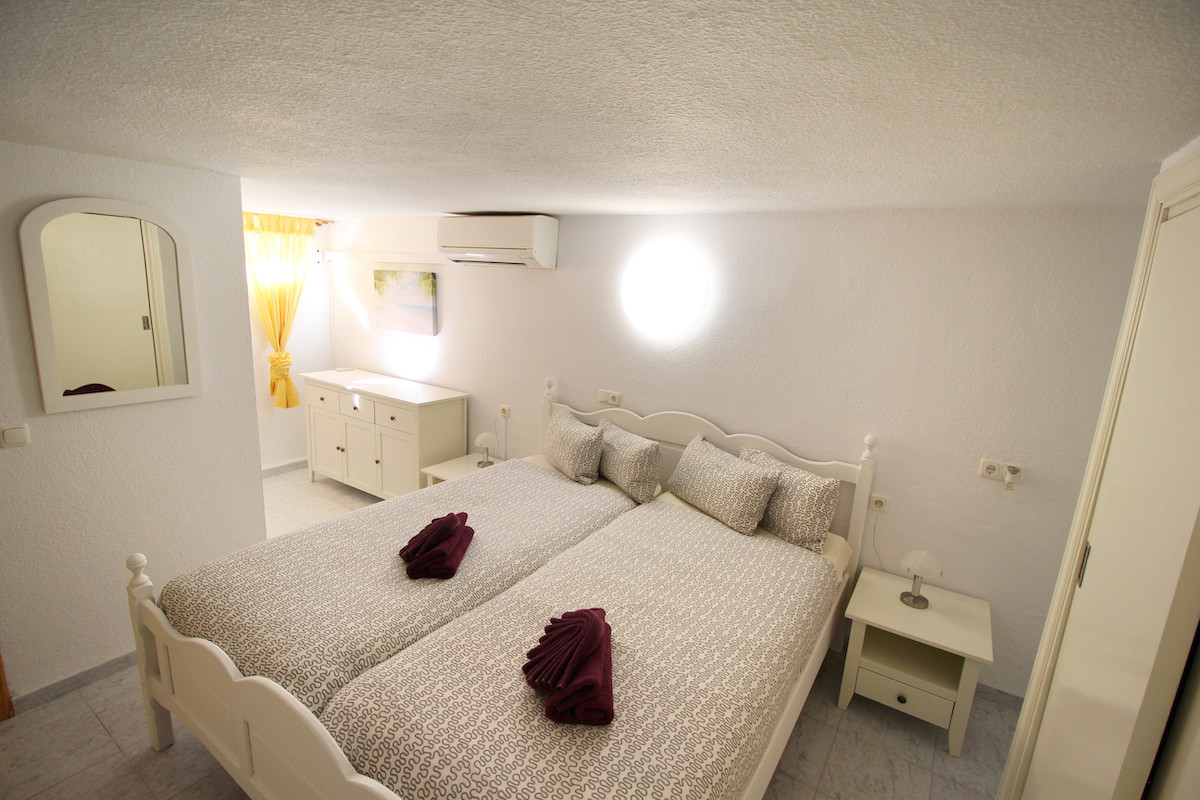 Im unteren Geschoss des Hauses finden Sie das Badezimmer und zwei gemütliche Schlafzimmer. Dank der modernen Klimaanlagen im ganzen Hause ist es nie zu heiß. Da lässt es sich nach einem sonningen Tag am nur 600 Meter entfernten Sandstrand ruhig und gut schlafen. Im großen Schlafzimmer steht ein Doppelbett, das kleinere Schlafzimmer enthält zwei einzelne Betten. Natürlich sind große Schränke vorhanden um ihre Kleidung ordentlich verstauen zu können. Für die ganz Kleinen gibt es selbstverständlich ein Kinderbettchen und einen Kinderstuhl. Im gut ausgestatteten Badezimmer auf Ebene der Schlafzimmer ist eine ebenerdige Dusche mit Glasschiebewänden eingebaut. Sie können sich auf den Urlaubstag vorbereiten und frisch in den Wohnbereich im Obergeschoss gehen. Hier erwartet Sie eine helle, offene Küche mit umfangreicher Ausstattung. Ihr Frühstück können Sie entweder direkt im angeschlossenen Essbereich, auf der gemütlichen, überdachten Terrasse oder im sonnigen Garten genießen. So gestärkt können Sie sich aufmachen um Cala Millor zu erkunden oder zum Baden an den Strand zu gehen.